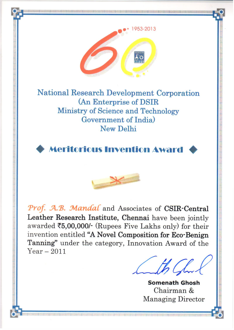 Congrats!! CSIR-CLRI won the NRDC Meritorious Invention Award for “A Novel Composition for Eco-Benign Tanning” Team : Prof.Dr.A.B.Mandal, Dr.C.Muralidharan, Mr.V.John Sundar, Mr.T.Rangasamy